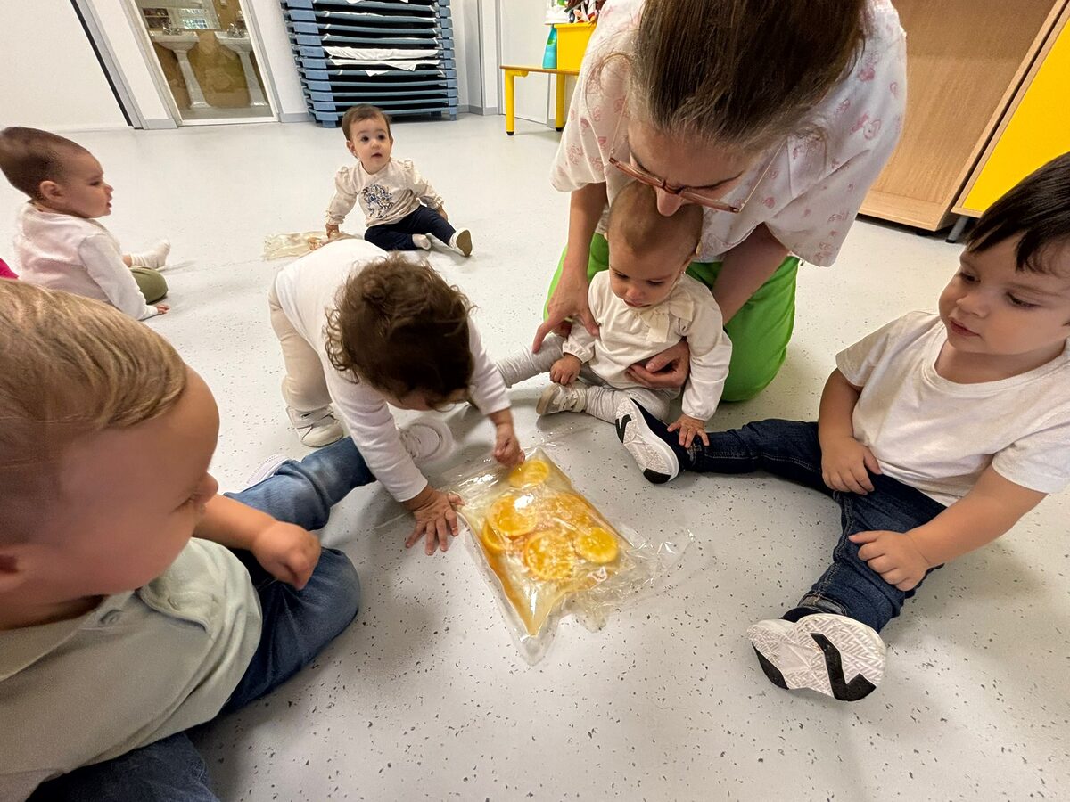 A propuesta de Lara y Alba, alumnas del IES Jálama, han explorado los frutos del otoño, su forma, color , olor , textura y sabor y luego han realizado una actividad muy entretenida buscando frutos por el patio que previamente se habían escondido. Mientras, en el aula azul experimentaban con la textura de la gelatina.