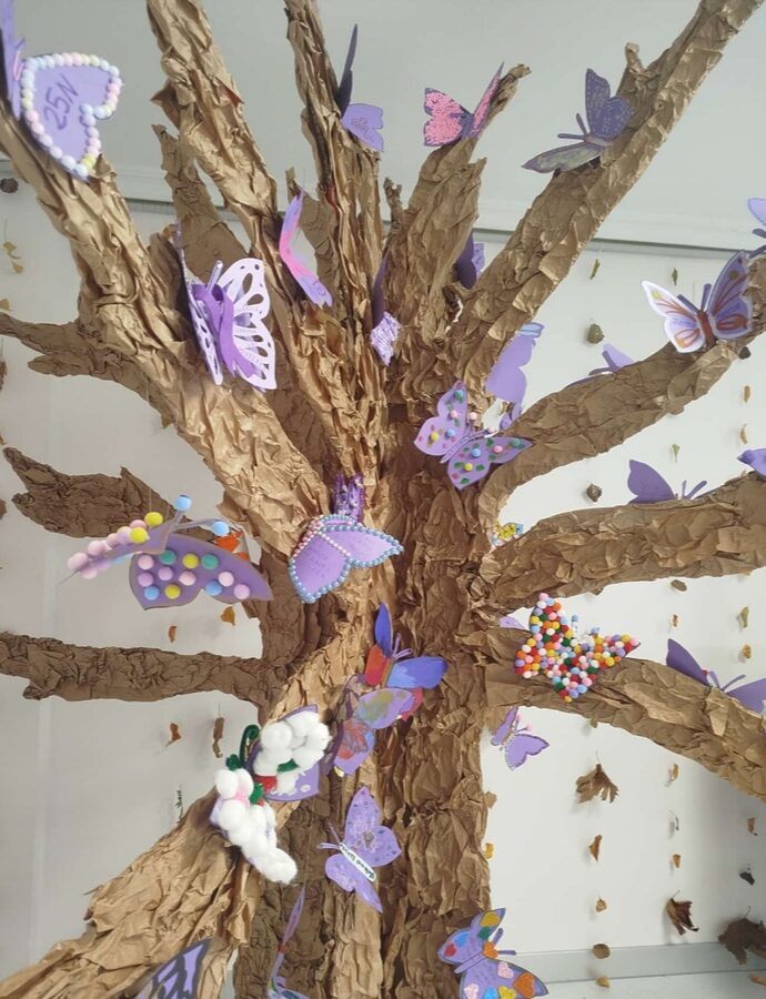 Este año hemos creado un mural colectivo para conmemorar el 25 de noviembre, Día Internacional de la Eliminación de la Violencia contra la Mujer. Cada niño y niña llevó a su casa una mariposa, símbolo de transformación y libertad. En familia, la han decorado y han escrito en ella mensajes de cariño, respeto y buen trato. Después, las han devuelto a la escuela para colocarlas en la entrada y formar el mural, esto nos recuerda que cada uno de nosotros podemos contribuir a un mundo donde crecer en igualdad sea algo natural.